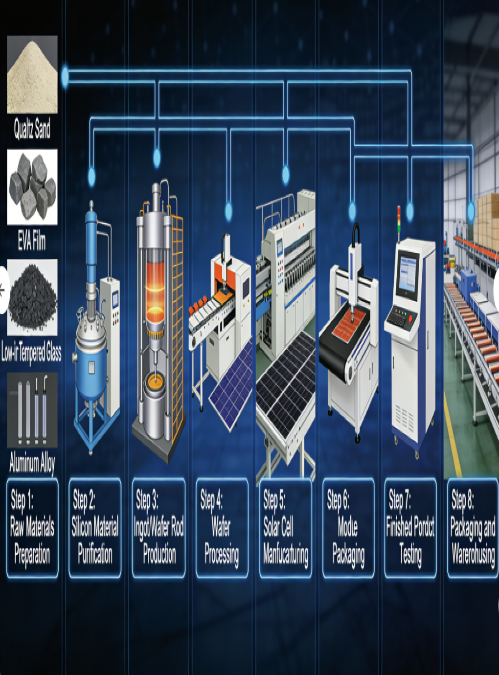 Our photovoltaic panel production line supports flexible production, compatible with HJT, TOPCon, PERC and other cell technologies, as well as G12, M10, M6 and other sizes of silicon wafers, which can quickly switch product specifications to meet customized needs of residential, commercial and utility-scale projects. Equipped with intelligent quality control systems such as EL and IV testers, it achieves real-time monitoring and full-process data traceability, ensuring each panel meets international standards.