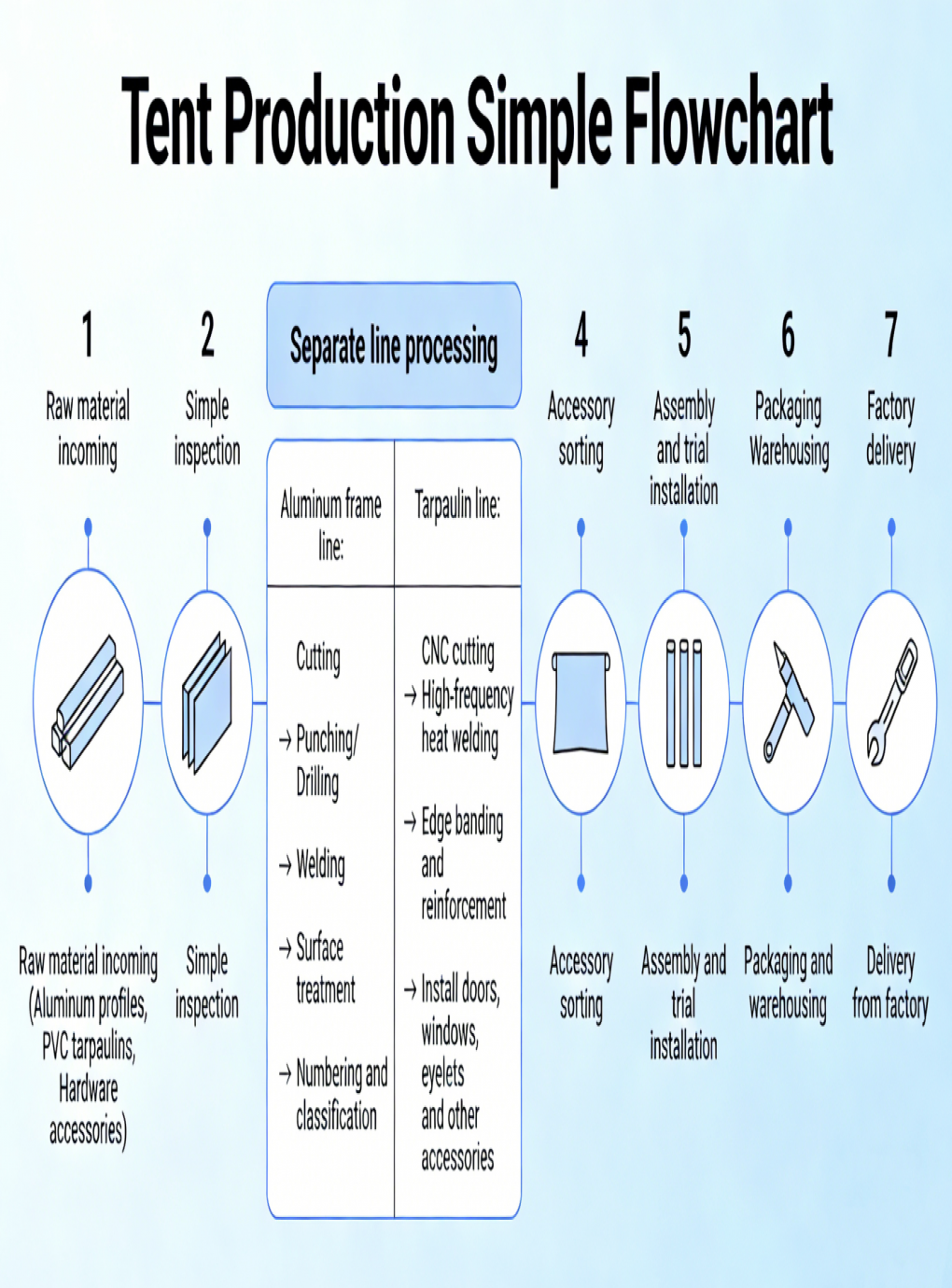 We have in-depth cooperation with professional manufacturers and suppliers in the tent production industry, covering all core links of the tent production line, including aluminum profile processing equipment, PVC tarpaulin processing equipment, and related accessories suppliers. We can provide targeted recommendations according to the investor's budget and production demand.